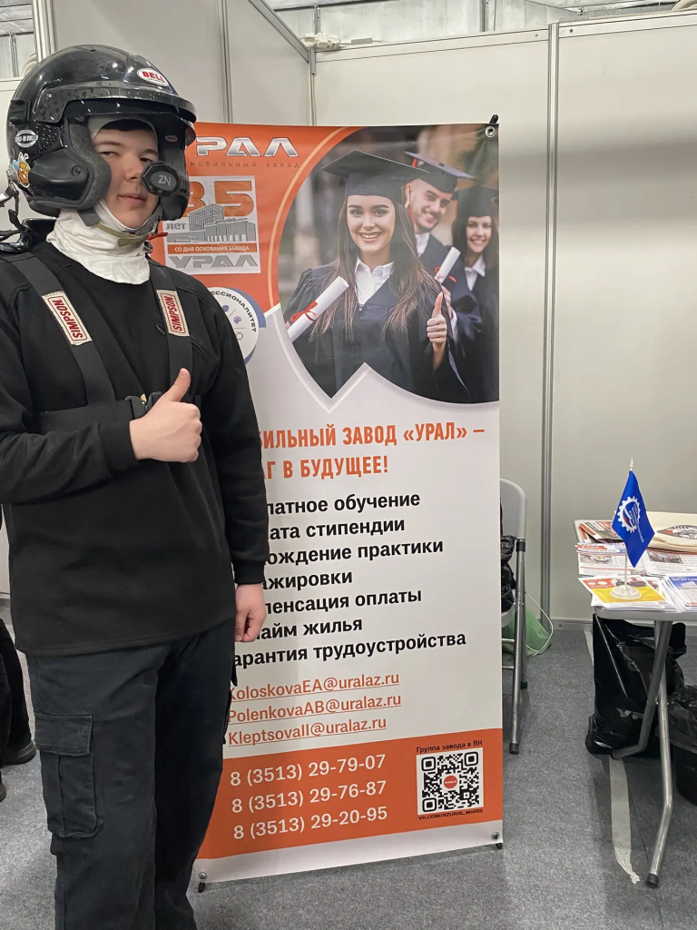 Автозавод «УРАЛ» на стенде рассказывает гостям выставки о перспективах целевого обучения и трудоустройства, а также предлагает почувствовать себя гонщиком, переодевшись в специальный костюм.