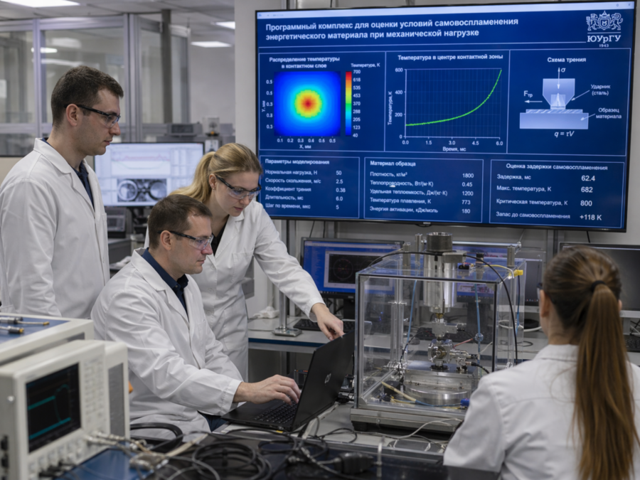 Уникальная математическая модель учитывает силу трения и тепловые потоки, которые распространяются в объемах как энергетического материала, так и железного ударника. После натурных экспериментов ученые смогли рассчитать распределение температуры в тонком контактном слое, что позволило оценить задержку (то есть время) самовоспламенения взрывчатого вещества при трении.